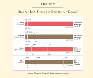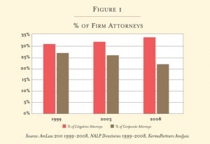 1 – We studied AmLaw 200 firms from 1999 (the first year of the AmLaw200) to 2008, creating a population of 134 firms that (i) were in the AmLaw 200 in 1999, 2003, and 2008, (ii) were not boutiques or the result of multiple mergers, and (iii) provided sufficient practice area data for each measurement period in the National Association for Law Placement publication  “Directory of Legal Employers.” In counting lawyers as corporate or litigation, we focused on the core practices, e.g., for corporate — mergers and acquisitions, securities, corporate governance, etc. to the exclusion of related practices of tax, real estate, bankruptcy, etc. The purpose of this was to compare apples to apples — true core transactional practice to true core litigation practice during the respective periods.
