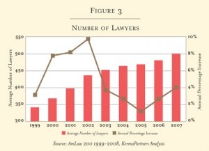 The impact of the growth of law firms’ dependence on litigation is magnified by the overall growth in the size of law firms (figure 3). The average size of an AmLaw 200 firm in 1999 was 345 lawyers. Last year it was just over 500 lawyers, a growth of 47 percent in eight years. That adds up to almost 13,000 more litigators in the AmLaw 200.
