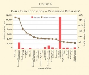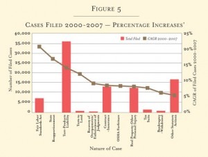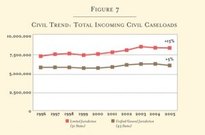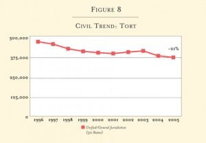 At the state level (according to the National Center for State Courts) the volume of civil cases has increased from around 13 million to 14.5 million from 1996 to 2005, an average annual increase of a little over one percent (figure 7). A large contributor to this sluggish growth in cases has been tort reform and the resulting 21 percent decrease in the number of tort cases over that same period (figure 8).