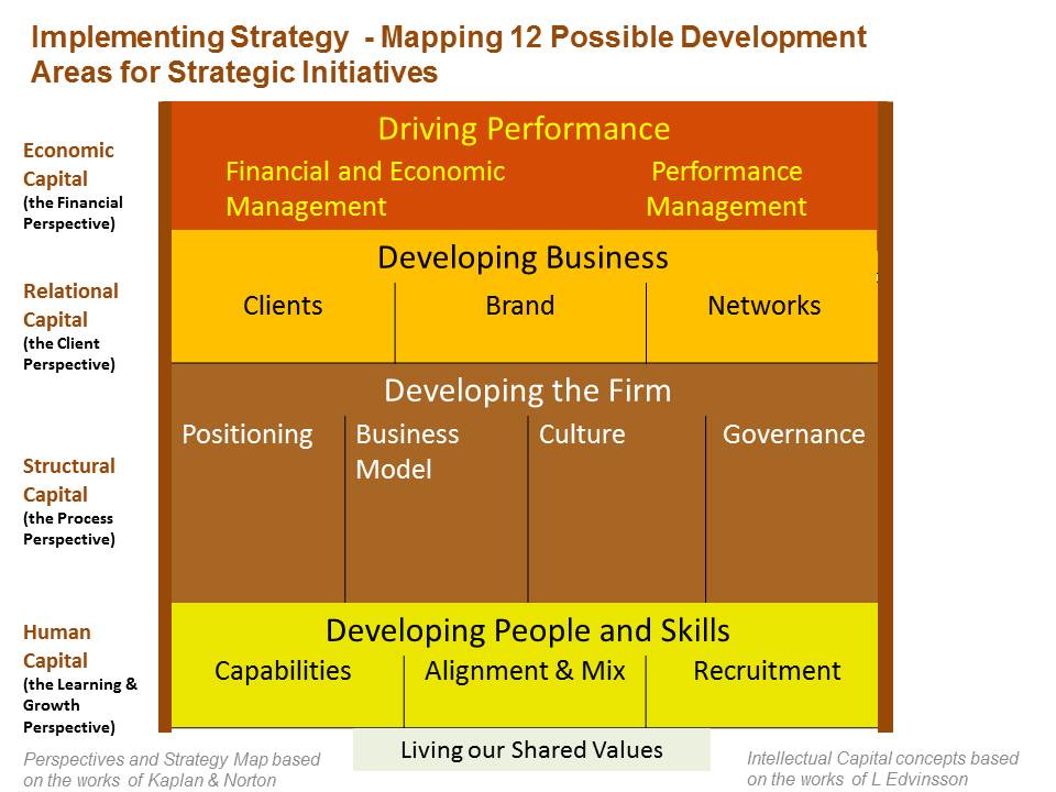 The creation of a Balanced Scorecard is not however the end of the story. The Balanced Scorecard helps to define the skills, competencies and contributions in general which the firm needs to develop within the firm. It is however also vital to define the various roles and responsibilities within firms which partners may have from the senior partner downwards. In this context, a strategy mapping process will help the firm to identify the areas where partners should have a role in assisting the firm towards its goals and objectives. The strategy map shown here is based upon the four perspectives of the Balanced Scorecard but is further divided into twelve areas all of which any firm needs to decide on the lines of responsibility and accountability. Whilst all partners have an interest in all twelve areas, some may have particular responsibilities which need to be clarified. In this paper, there is only space to consider by way of example the two levels at the bottom of the map.