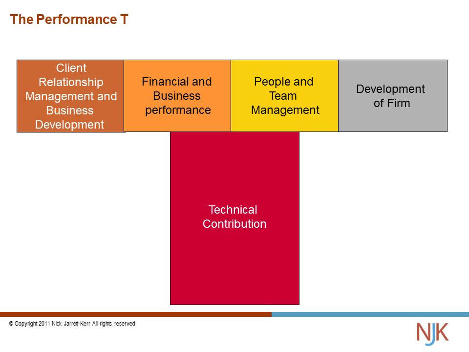 Some firms like to express their balanced scorecard or Critical Areas of Performance in the form of a T. The vertical part of the T illustrates the depth of the lawyer’s technical expertise. The horizontal bar shows the breadth of the professional’s overall contribution as a manager and an owner. The newly promoted partner, for instance, should show a strong and deep technical expertise but may not have developed broader management expertise; his or her T will be more in the shape of an ‘I’ or a hammerhead. As the partner develops, the horizontal bar will extend until it reaches a balanced proportion. It is also quite possible – perhaps in the case of a managing partner – for the management skills on the horizontal bar to predominate to the virtual exclusion of the vertical ‘technical skills’ part of the bar. Hence, the difficult task facing former managing partners and senior partners is to re-build their technical skills or to face leaving the firm.