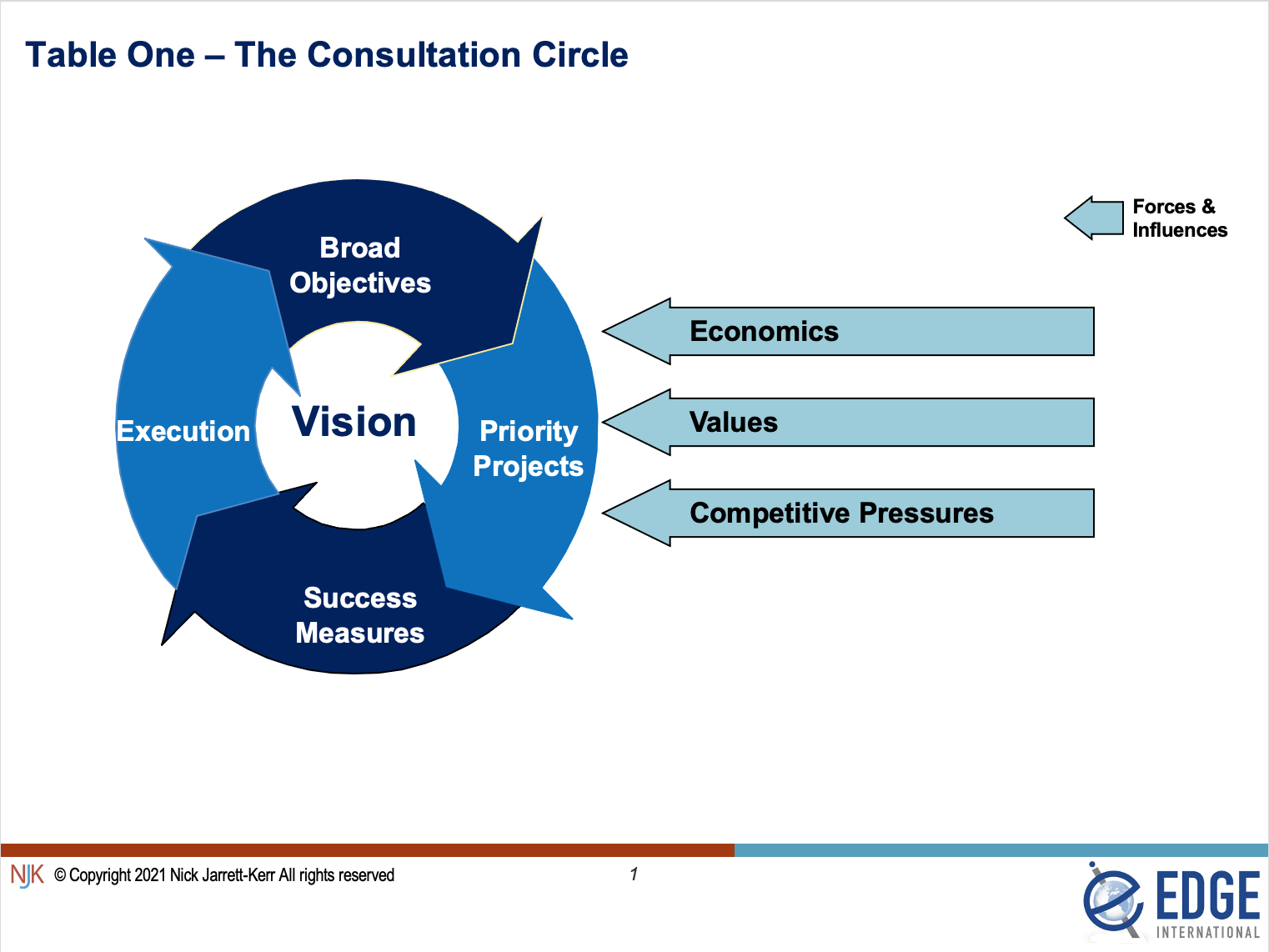 Strategic planning and strategy execution are best seen as an integrated and iterative process in which the broader and more visionary aspects are then cascaded down into action throughout the firm. In corporations, the leaders of the company for the most part craft the strategic choices involving larger long-term investments, and then tend to cascade the more concrete, day-to-day decisions down the hierarchical structure.  Professional service firms (except the very large ones) tend to be smaller and less hierarchically layered than larger corporations but the same thinking applies to firms of all sizes; that the leaders should first agree and set out a broad path and vision which will hopefully stimulate the action that should follow lower down the organisation.  The cascade imagery is helpful to a point but still has overtones of a hierarchical delegation. I prefer the imagery of a closed loop approach (such as illustrated in Table One) which stresses the collaborative aspects of strategic planning without which lawyers at the coal face will not take responsibility or ownership.  It achieves this by facilitating an information consultation and feedback feature that enables plans to be checked and adjusted in the light of experience and outcomes.  In this approach, rather like a ball being tossed and caught back and forth, or round and round, the purpose is to give all the participants in the process the opportunity, at each level, to help decide the implementation steps (and the accountability for these steps) to achieve each strategic priority project, and the accompanying success measures. This process of circling back is particularly important where there might be problems in capability or capacity (human or financial), and to establish what resources are be available and what commitments need to be made to address the execution of any plan that is agreed.  All the time during this consultation phase, other forces and influences will arise to inform the discussions and processes – the firm’s financial health, the values the firm espouses and the competitive pressures that the firm faces being some of those.