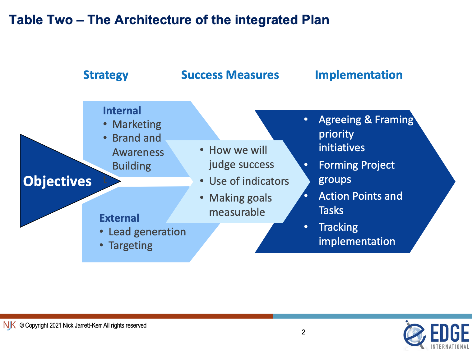 After this process has been concluded, it is then possible (as illustrated in Table Two) to design and build a truly integrated plan that links all the essential moving parts and introduces lines of accountability and feedback.  At this stage the broad path can be fleshed out with more detailed projects, timelines and actions. The magnitude of the current challenges to the professional service sector cannot be understated. If Table One is seen as a spinning wheel, then it needs to spin ever more speedily.