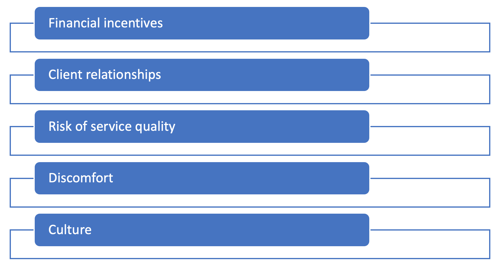 Protection of client relationships is not something professionals will willingly admit as an obstacle to collaboration but they do perceive the introduction of others or the delegation to peers as a threat to the relationship they have with the client and their livelihood. While partners of a firm will pay lip service to the notion that all clients are “our clients”, the “my client” attitude is still present under the surface. This is not to say that they are selfish or badly intended; it is human nature to want to retain client recognition and success.