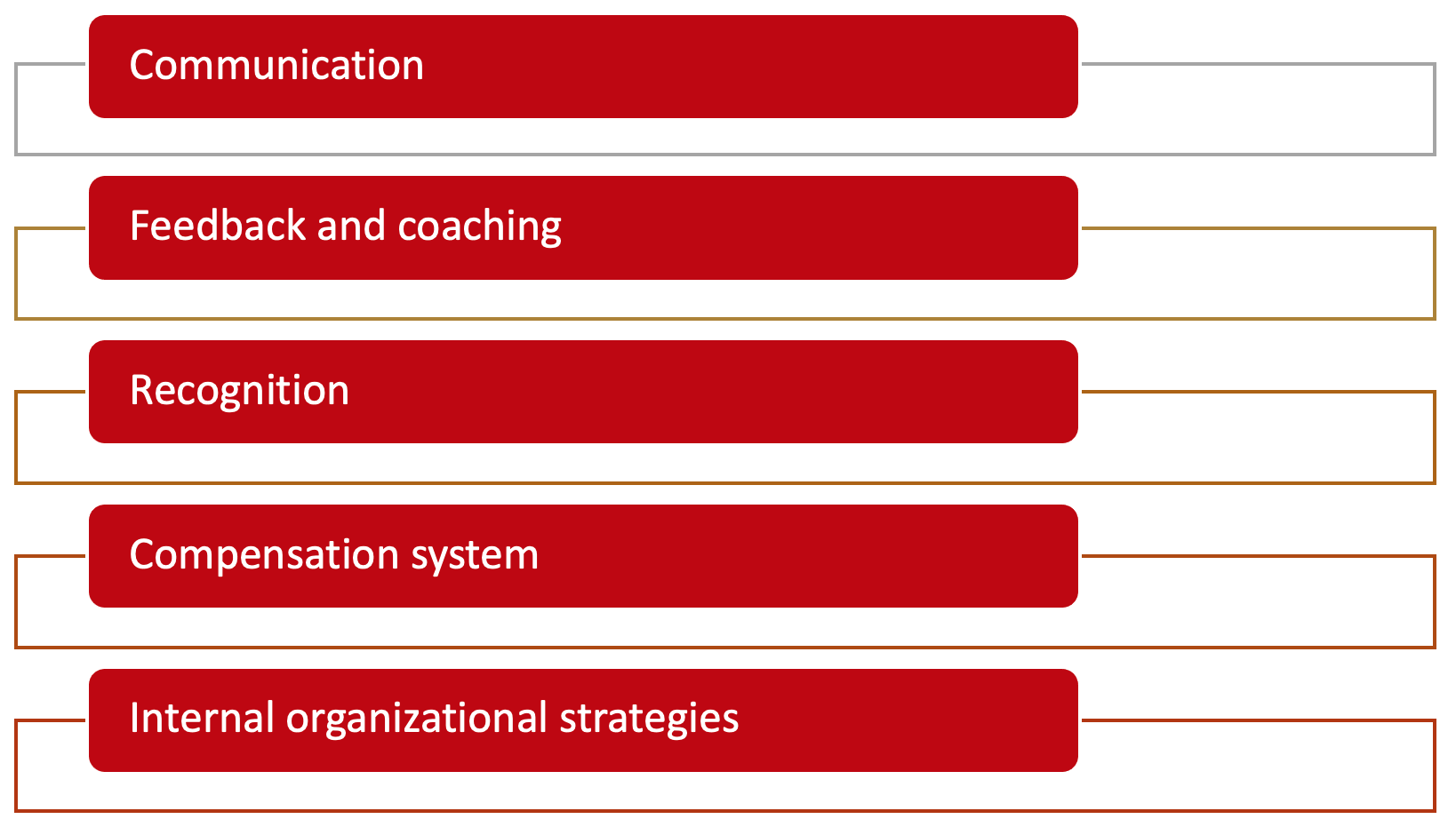 Feedback and coaching at the individual level should be used to address these concerns and provide suggested approaches. They provide responses at a more personal level and which people may not want to address at firmwide or group meetings and trainings. It is through such conversations that professionals may be convinced that while collaboration can benefit many, it also breeds individual success and that any perceived risks of introducing colleagues to clients or working with them is lower than the risk of losing clients to the competition. Furthermore, professionals should be encouraged to be “first movers”; after all, it is much easier to receive a favor if you first give one.