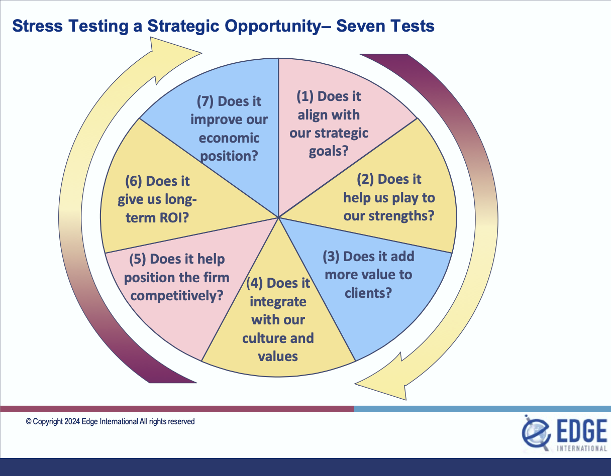 Test Number Three – Does the opportunity add more value to clients? It is always a good test of any strategic initiative to work out how the initiative would be presented to clients. An initiative that is driven by no other purpose than a profit motive is hard to explain to clients in terms that that they might find useful. In contrast, deeper or wider expertise, for instance, may be compelling, as would a stronger base from which to invest in efficiency measures.