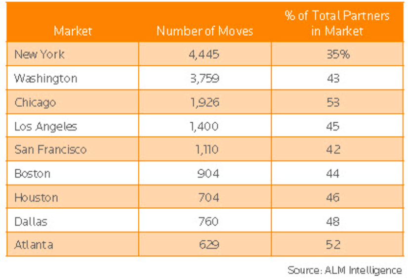 The risk is real. Look at this recent table of partners who were in the market to move or have moved in the period 2010-2017. If you’re a firm leader in Atlanta or Chicago, look over your shoulder – over half the partners are looking to move!
